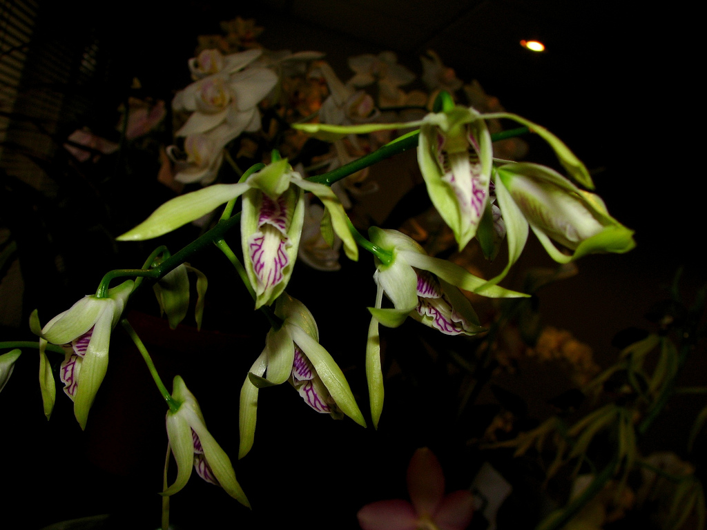 Found in the Solomon Islands on trees and coral at elevations of sealevel to 100 meters as a large sized, hot growing epiphyte with yellow with dark maroon striped canes carrying many narrowly elliptic leaves that blooms on arching to suberect, 12" [30 cm] long, 5 to 15 flowered inflorescence with fragrant flowers