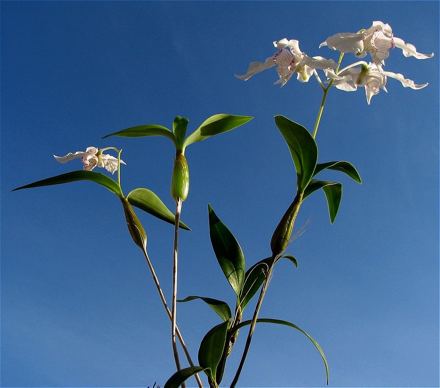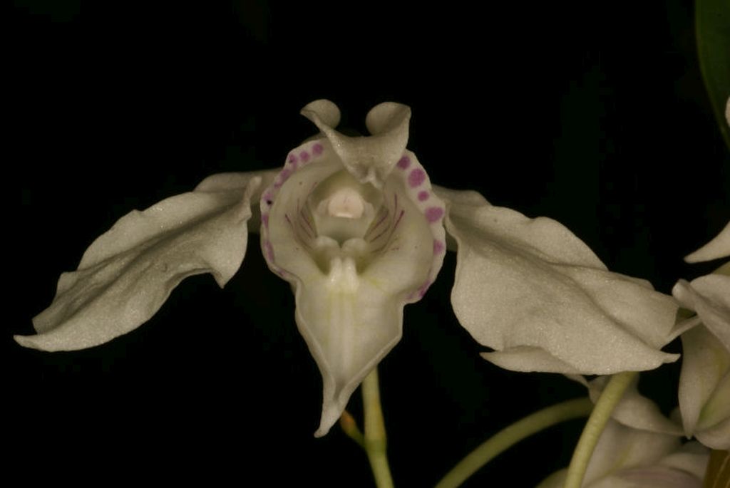This small to medium sized, warm to cool growing species originates from eastern New Guinea to Bougainville Island and is found at elevations of 800-1200 meters on trees in montane rainforests or as a terrestrial on steep wet moss covered slopes. The plant has basally fusiform to apically swollen, yellow, 3 to 5 noded stems below the 2 to 4, dark green, persistent, leathery, spreading leaves and blooms from March till May and August and September on an erect or arching, short to 3" [to 7.5 cm], few flowered raceme with 3 to 8, waxy, fragrant flowers that arise from the apex of a cane and requires regular waterings and fertilizer through out the year.