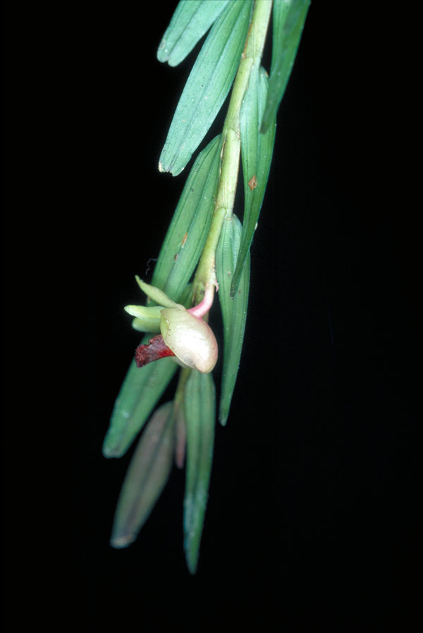 Found in New Guinea at elevations around 1200 meters as a medium sized, cool growing epiphyte with erect, flattened, densely leafy stems carrying many, erect, linear leaves that blooms in the mid winter through fall on a short, single flowered inflorescence.
