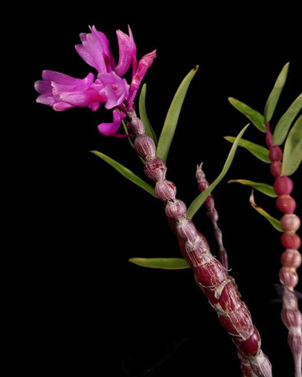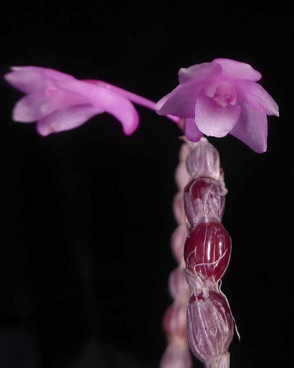 Found on Lomok Island within the Lesser Sunda Islands of Indonesia at elevations of 1925 to 2000 meters as a mini-miniature to small sized, cool growing epiphyte with an erect, basally terete, becoming fatter till the middle, thinner above, globose segmented in the upper half pseudobulbs carrying a few, lanceolate, acute leaves that blooms in the fall on short, arising along the upper nodes of the stem, 8 flowered inflorescence.