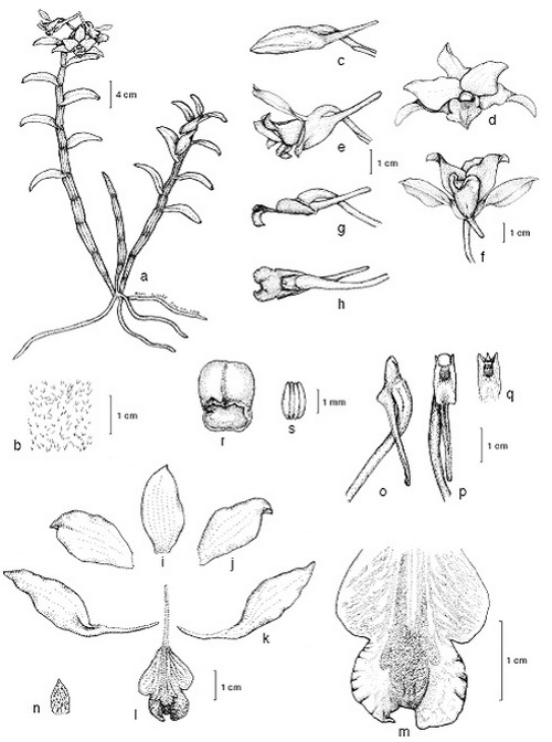 Found in Vietnam on boulders or tree branches at elevations of 1000 to 1200 meters as a small to medium sized, cool growing epiphyte or lithophyte with clustered, erect, narrowly fusiform, slightly flexuous, weakly sulcate with age, leafy throughout stems almost completely enveloped by leaf sheaths and carrying distichous, patent, slightly recurved, coriaceous, lanceolate, entire, dark green, both surfaces covered by dense hirsute hairs, adaxial hairs brownish, abaxial hairs blackish, unequally bilobed apically, leaves that blooms in the late summer and fall on a very short, terminal or axillary, arising towards the apex of the stem, 1 to 5 flowered inflorescence with ovate-triangular to lanceolate-triangular, acuminate, concave, brown, abaxial surface brown haired, adaxial surface glabrous floral bracts and carrying sweetly scented flowers.