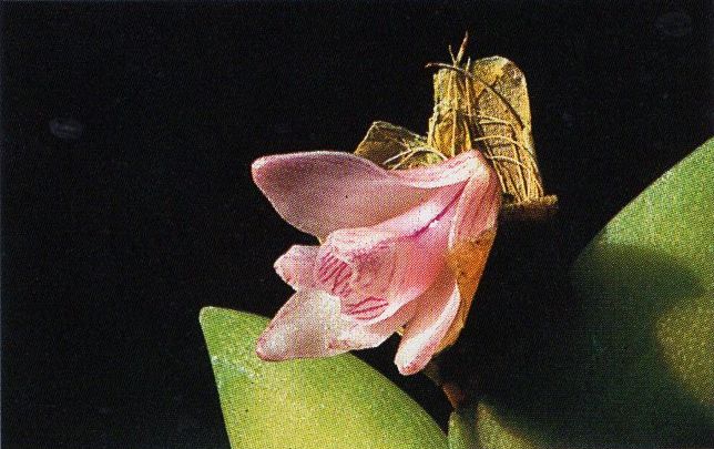 Found in Java and Sumatra at elevations of 700 to 1500 meters as a small sized, warm to cool growing epiphyte with very compressed, penduous, not branched stems carrying all along the stem, triangular, often suffused with violet in youth, lower margin rounded leaves that blooms in the spring on a very short, single flowered inflorescence arising from the upper nodes of the stem near the apex.