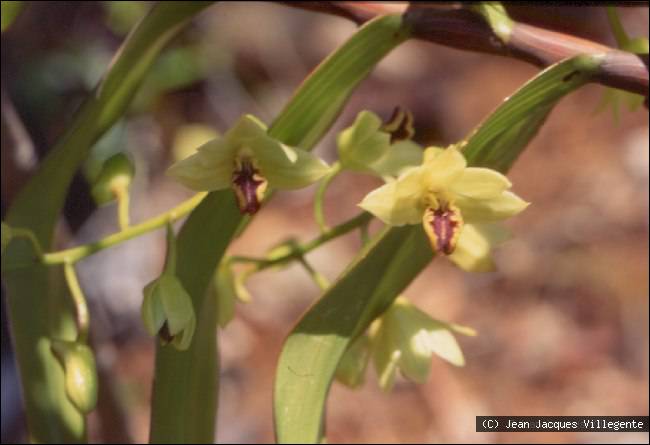 Found in New Caledonia along forest edges at elevations around 150 meters as a giant sized, hot growing terrestrial with tall, woody, bamboo-like canes carrying, distichous, linear-lanceolate leaves that blooms spring through fall on several, lateral, to 4" [10 cm] long, successively few, 8 to 15 flowered inflorescence.