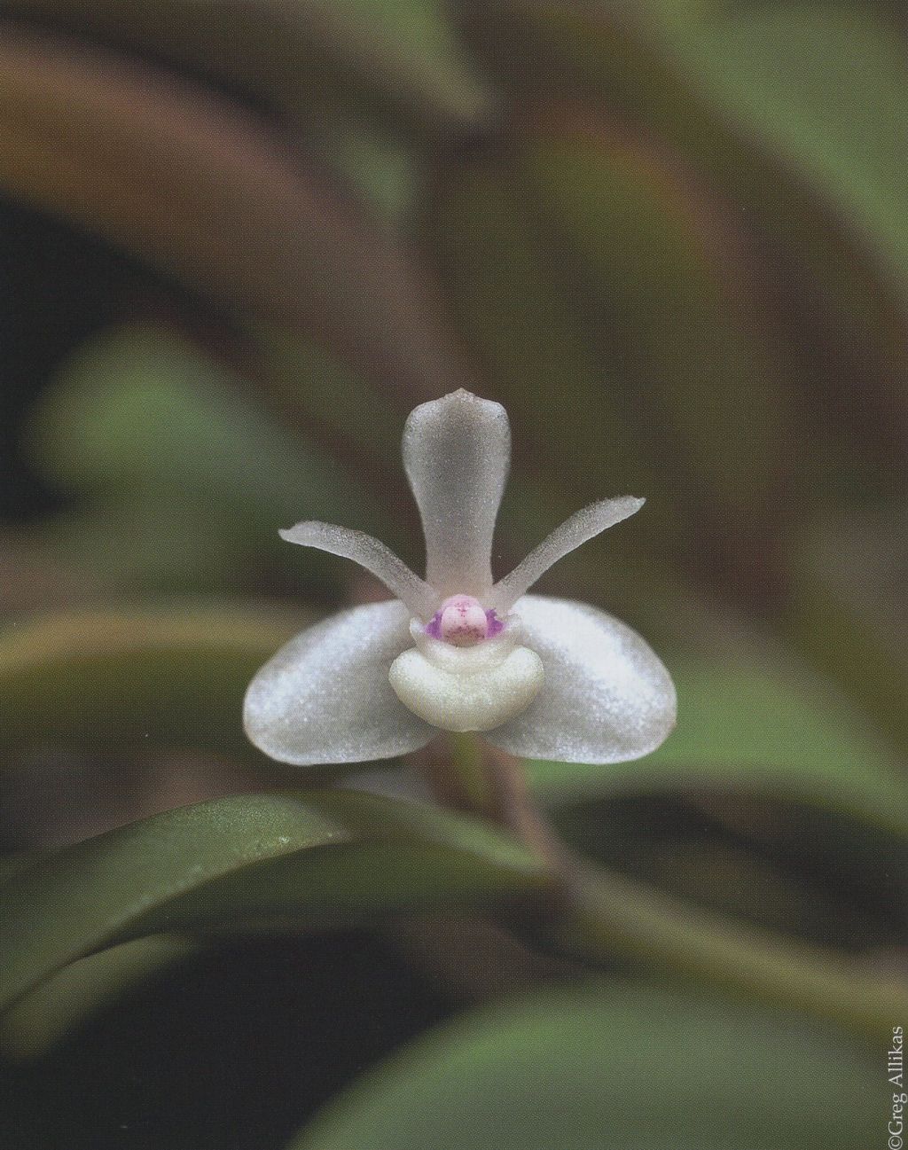 Found on Biak Island in New Guinea without locality as a mini-mniature sized, warm growing epiphyte with erect, sometimes twisting, tapering towards the base, constricted above a basal swelling, roughly 4 sided, green with an apical black ring, lower third enveloped by a close fitting, brown, ribbed sheath, shredding with age, with 1 to 2 persistent basal sheaths as well pseudobulbs carrying a single, terminal, moer or less erect, sometimes curving, elliptical to ovate-elliptic, green, coriaceous, smooth above, slightly roughened beneath, acute to obtuse apically, unequally and minutely bilobed leaf that blooms in the fall on a peduncel .16 to .2" [4 to 5 mm] long, with 1 to 2 close fittiing, brown, basal, bracts, arising through a spathe, successively single, few flowered inflorescence.