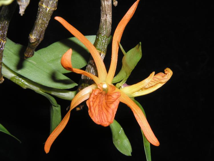 Found in India, Myanmar and Thailand on Rhododendron bushes at elevations of 1500 to 1800 meters as a miniature sized, cool growing epiphyte with slender to swollen, spindle-shaped pseudobulbs carrying 2 to 8, glossy, linear to elliptic-lanceolate leaves that blooms in the late winter to the early summer on a lateral, .8 to 1.2" [2 to 3 cm] long, 1 to rarely 3 flowered inflorescence arising from the upper nodes of an older, mature cane and carrying very large for the size of the plant, orange-scented flowers