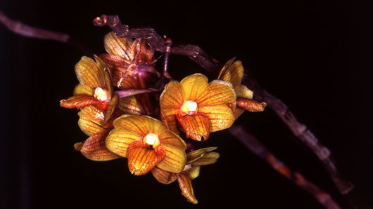 Found in Sabah Borneo in hill forests at elevations of 200 to 600 meters as a medium sized, hot to warm growing epiphyte with clustered, erect, internodal, distinctly ribbed stems carrying several, narrowly elliptic, acute, deciduous leaves that blooms on a pendent, to 1.2" [3 cm] long, purple green, 5 to 8 flowered inflorescence arising on leafless stems with triangular, acute, translucent greenish-purple floral bracts.
