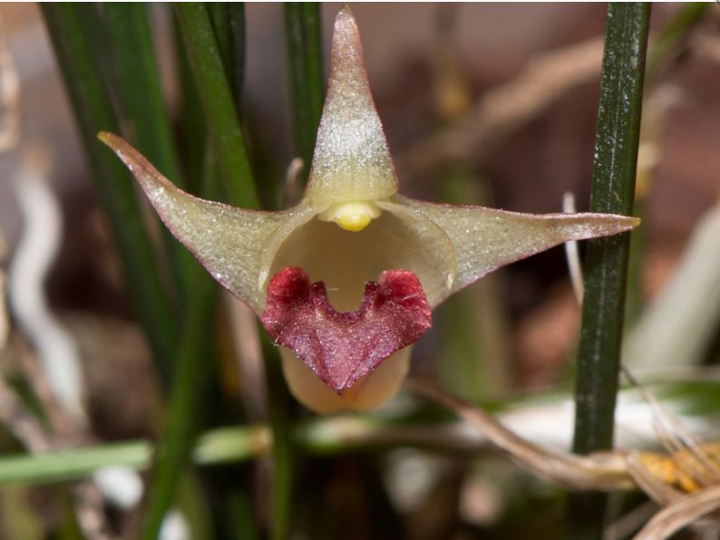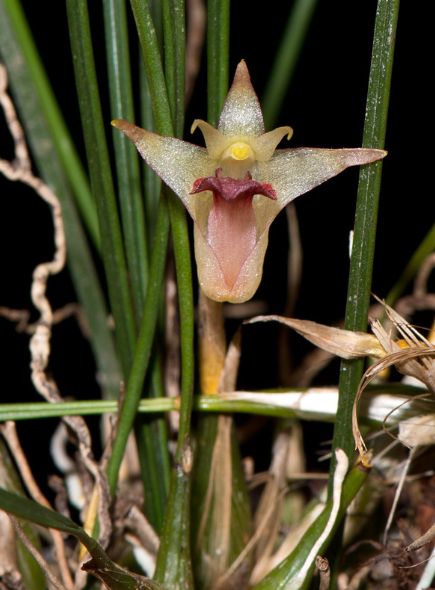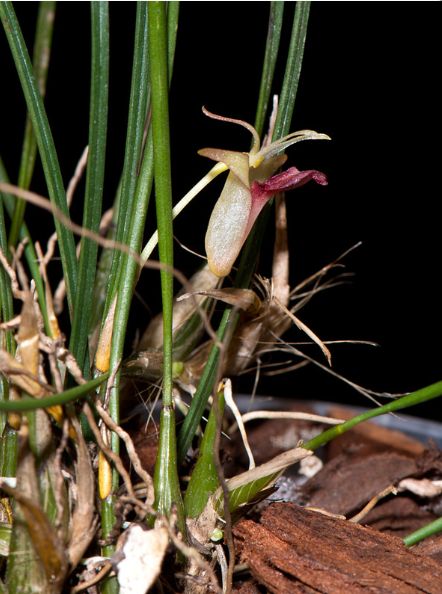 Found in Papua New Guinea in primary forests at elevations around 250 to 300 meters as a mini-miniature sized, hot growing epiphyte with clustered, narrowly conical ovoid, enveloped by several sheaths and carrying a single, erect, more or less curved, vewry narrowly linear, semi-terete, almost subulate apically leaves taht blooms in the spring on an erect, peduncle .8" [2 cm] long, .88" [2.2 cm] long, ovarall, gradually tapering towards the apex, single flowered inflorescence.