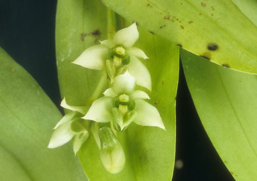 This hot growing New Guinea epiphyte occurs at elevations of 300 to 500 meters with cylindrical pseudobulbs carrying a single, apical, lanceolate-elliptic, obtuse, acuminate, cuneate below leaf that blooms in the winter on a wiry, erect to arching, from 1 1/4' to 4 3/4" [3.1 to 11.8 cm] long, racemose, laxly few to several flowered inflorescence that arises from the nodes at or near the apex of the cane.