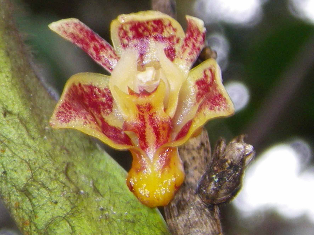 Found in Sarawak and Sabah Borneo in lower to upper montane mossy forests at elevations of 1200 to 2600 meters as a small to large sized, cool to cold growing epiphyte with clustered, suberect, shiny yellow, dark banded at nodes, somewhat zigzag, flattened and enveloped by clasping leaf sheaths and carrying many, distichous, rigid, lanceolate, abruptly tapering to a slender apex leaves that blooms in the fall on a very short, successively single flowered inflorescence arising from tufts of dry scales towards the apex of each leafless and leafy canes with the flowers held close to the stem