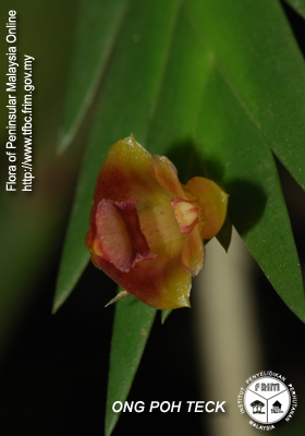 Found in the Thailand, Malaysia, Sumatra and Borneo? in lowlands and lower montane mossy forests at elevations of 500 to 1600 meters as a miniature sized, warm to cool growing epiphyte with simple to branching, pendulous, leafy stems carrying many, lanceolate, flat, fleshy, densely overlapping, alternate leaves that blooms on a short, single to few flowered inflorescence