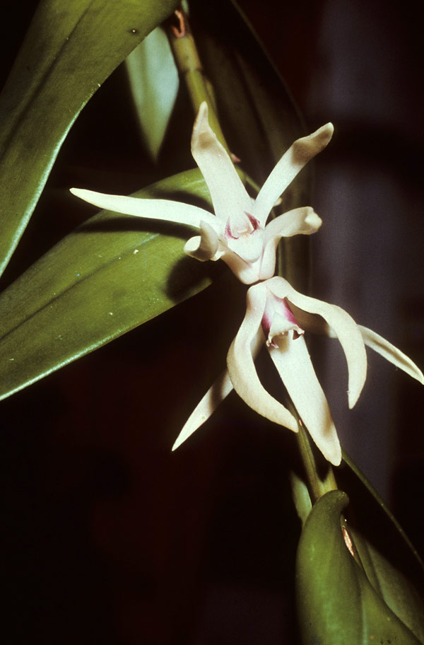 Found in Fiji, Samoa and Vanuatu on isolated trees and in open and coastal forests at elevations of sealevel to 900 meters as a large sized, hot to warm growing epiphyte with clustered, slender, pendulous to erect stems enveloped by sheathlike leaf bases and carrying many, distichous, rigidly leathery, narrowly ovate to lanceolate, unequally bilobed apically leaves articulated below to the stem that blooms in the winter and spring on a 1.6" [4 cm] long, 2 flowered inflorescence arising from the nodes at the apex of the stem opposite the leaves.