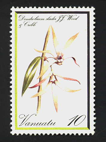 References W3 Tropicos, Kew Monocot list , IPNI ; AOS Bulletin Vol 51 No 12 1982 stamp fide; Orchids of Vanuatu Lewis & Cribb 1989 photo fide; Allertonia Vol 5 No 1 Kores 1989; Orchid Species Culture; Dendrobium Bakers 1996; The Orchids of Samoa Cribb & Whistler 1996 photo good; Dendrobium and its Relatives Lavarack, Harris and Stocker 2000 as Grastidium sladei photo fide;