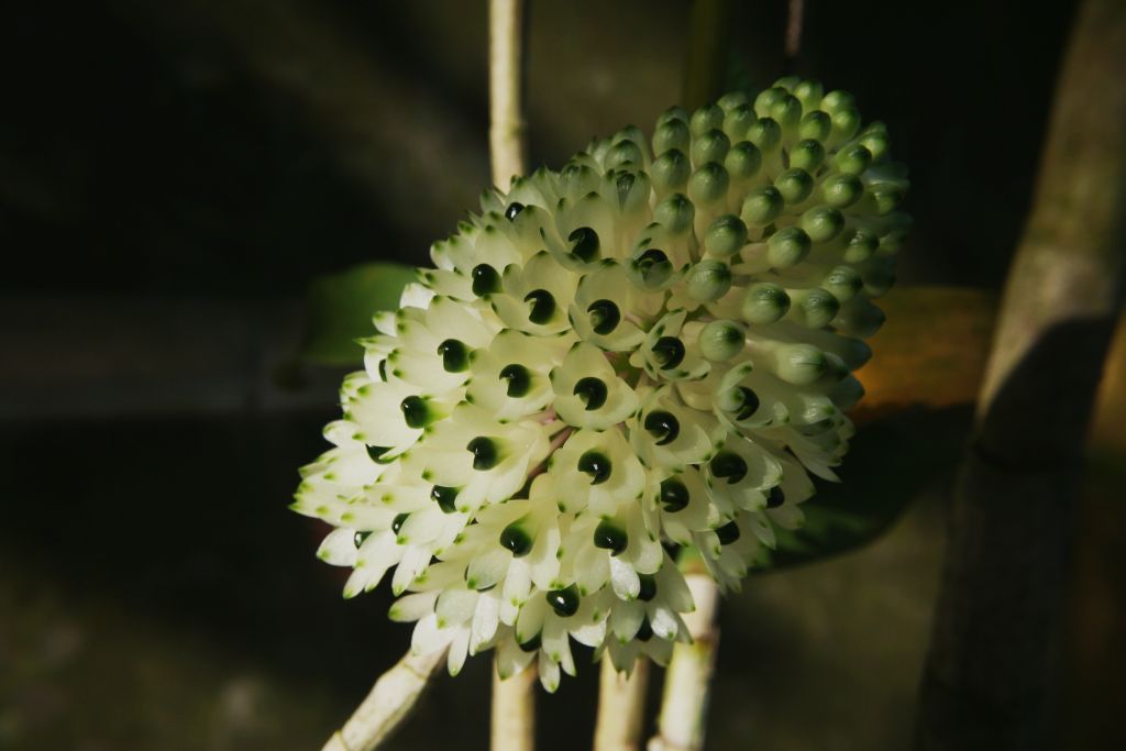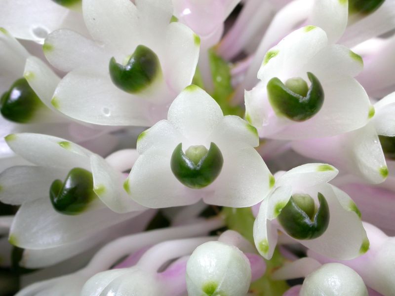 Found in Queensland Australia as well as Papua and New Guinea growing on tree limbs, trunks, tree crooks where leaves have accumulated to form soil and on rocks in lowland open forests near the edge of rainforests at elevations under 600 meters as a large sized, hot to warm growing epiphyte with slender, fusiform, leafy throughout, sulcate with age stems enveloped by thin, scarious sheaths and carrying oblong or lanceolate, very thin, twisted or curved, acute leaves that blooms in the winter and spring on an erect, 1.6 to 5" [4 to 12.5 cm], densely many flowered raceme that arise from near the apex of the leafless cane, carrying stiff, thick, waxy and fleshy, tubular flowers held in a ball.