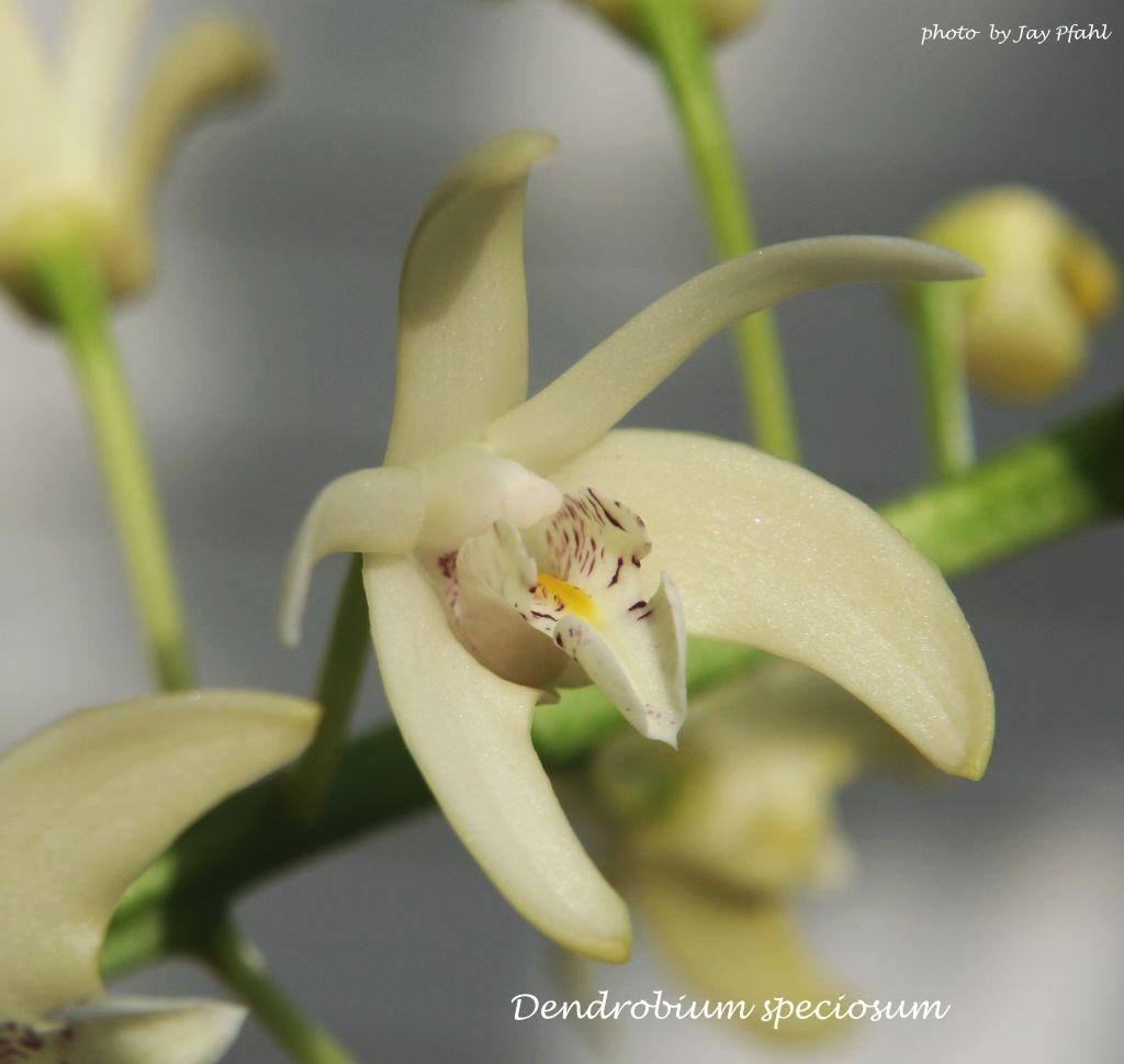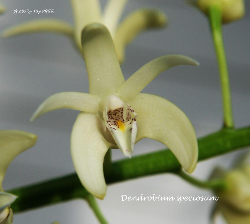 References W3 Tropicos, Kew Monocot list , IPNI ; Orchidaceae Monandre-Dendrobiinae Fr. Kraenzlin 1910; Orchidaceae Monandre-Dendrobiinae Fr. Kraenzlin 1910 D speciosum frma grandiflorum; Orchidaceae Monandre-Dendrobiinae Fr. Kraenzlin 1910 D speciosum var curvicaule; Orchidaceae Monandre-Dendrobiinae Fr. Kraenzlin 1910 D speciosum var fusiforme; Die Orchideen Schlechter 1915 as D hillii; Die Orchideen Schlechter 1915; Die Orchideen 2 Auflage Schlechter 1927 as D hillii; Die Orchideen 2 Auflage Schlechter 1927; AOS Bulletin Vol 28 No 9 1959; Encyclopedia of Cultivated Orchids Hawkes 1965; Encyclopedia of Cultivated Orchids Hawkes 1965 as D speciosum var hillii; AOS Bulletin Vol 35 No 4 1966 photo fide; AOS Bulletin Vol 36 No 6 1967 photo fide; Orchids of Australia Nicholls 1969 drawing fide; The Orchids of New South Wales Rupp 1969; The Orchids of New South Wales Rupp 1969 as D speciosum var gracillimum; The Orchids of New South Wales Rupp 1969 as D specieosum var hillii; Flore de la Nouvelle-Caledonie et Dependences Vol 8 Orchidaceae Halle 1977; Die Orchideen lieferung 11/12 633 - 752 Brieger 1981 as Dendrocoryne speciosum drawing/photo fide; Die Orchideen lieferung 11/12 633 - 752 Brieger 1981 as D speciosum var fusiforme photo fide; AOS Bulletin Vol 51 No 5 1982 photo fide; Dendrobium Orchids of Australia Upton 1989 drawing/photo fide; Dendrobium Orchids of Australia Upton 1989 as D speciosum var hillii drawing/photo fide; Dendrobium Orchids of Australia Upton 1989 as D speciosum var grandiflorum drawing fide; Dendrobium Orchids of Australia Upton 1989 as D speciosum var capricornicum derawing fide; Dendrobium Orchids of Australia Upton 1989 as D speciosum var curvicaule drawing fide; Dendrobium Orchids of Australia Upton 1989 as D speciosum var pedunculatum drawing fide; A Guide to Orchids of the World Hodgson, Paine & Anderson 1991 Photo good; The Manual Of Cultivated Orchid Species Bechtel, Cribb & Laurent 1992 photo fide; The Illustrated Encyclopedia of Orchids Pridgeon 1992 photo fide; AOS Bulletin Vol 63 No 7 1994 photo fide; AOS Bulletin Vol 63 No 7 1994 as D tarberi photo fide; AOS Bulletin Vol 63 No 10 1994 photo fide; AOS Bulletin Vol 63 No 10 1994 as D taberi photo fide; Manual of Orchids Stewart 1995; Orchid Species Culture; Dendrobium Bakers 1996 as D curvicaule; Orchid Species Culture; Dendrobium Bakers 1996 as D pedunculatum; Orchid Species Culture; Dendrobium Bakers 1996; Orchid Species Culture, Dendrobium Bakers 1996 as D tarberi; Orchid Digest Vol 61 #2 1997 photo fide; Orchid Digest Vol 62 #1 1998 photo fide; AOS Bulletin Vol 67 No 9 1998 as D speciosum var hillii photo fide; Orchid Australia Vol 11 No 3 1999 photo; AOS Bulletin Vol 69 No 2 2000 as D speciosum var hillii photo fide; Dendrobium and its Relatives Lavarack, Harris and Stocker 2000 photo fide; Dendrobium and its Relatives Lavarack, Harris and Stocker 2000 as D speciosum var curvicaule photo fide; Dendrobium and its Relatives Lavarack, Harris and Stocker 2000 as D speciosum var grandiflorum photo fide; Dendrobium and its Relatives Lavarack, Harris and Stocker 2000 as D speciosum var pedunculatum photo fide; Orchids Australia Vol 13 No 2 2001; Australian Orchid Review Vol 66 No 5 2001 photo; Orchids Australia Vol 12 No 6 2000 photo; Australian Orchid Review Vol 67 No 1 2002 photo; Botanica's Orchids 2002 photo fide; Australian Orchid Review Vol 69 No 1 2004 photo; Australian Orchid Review Vol 69 No 3 2004 photo; Australian Orchid Review Vol 70 No 3 2005; Flora's Orchids Nash & La Croix 2005; Australian Orchid Review Vol 71 No 1 2006 photo; Australian Orchid Review Vol 71 No 5 2006 photo; The Dendrobiums H. P. Wood 2006 photo fide; Native Orchids of Australia Jones 2006 as Thelychiton capricornicus photo good; Native Orchids of Australia Jones 2006 as Thelychiton speciosus photo fide; Native Orchids of Australia Jones 2006 as Thelychiton curvicaulis photo good; Native Orchids of Australia Jones 2006 as Thelychiton pedunculatus photo good; Australian Orchid Review Vol 72 No 2 2007 photo; AOS Bulletin Vol 78 #4 2009 photo fide; Orchid Digest Vol 74 #4 2010 photo fide; AOS Bulletin Vol 79 #3 2010 photo fide; Le Petit Larousse des Orchidees Lecoufle, Barthelemy & Schmidt 2013 photo fide; AOS Bulletin Vol 83 #3 2014 photo fide; Orchid Digest Vol 80 #1 2016 photo fide; Orchid Digest Vol 80 #2 2016; AOS Bulletin Vol 85 #2 2016 as D speciosum var curvicaule photo fide; AOS Bulletin Vol 85 #3 2016 as Dendrolabium speciosum drawing fide; AOS Bulletin Vol 86 #2 2017 photo fide; AOS Bulletin Vol 86 #2 2017 as D speciosum var hillii photo fide; AOS Bulletin Vol 86 #3 2017 as D speciosum var grandiflorum photo fide; Orchid Digest Vol 82 #3 2018 photo fide; AOS Bulletin Vol 88 #8 2019 photo fide;