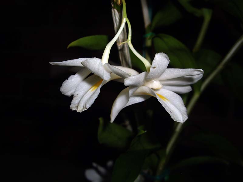 Found in Thailand and Malaysia at elevations of 910 to 1800 meters as a small to medium sized, warm to cool growing epiphyte with purplish, erect stems carrying many, all along the stem, thin, lanceolate, acute, dark green and sometimes suffused with purple leaves that blooms in the winter on a pendulous, .9" [2.2 cm] long, 1 to 2 flowered inflorescence arising on older mature leafy canes.