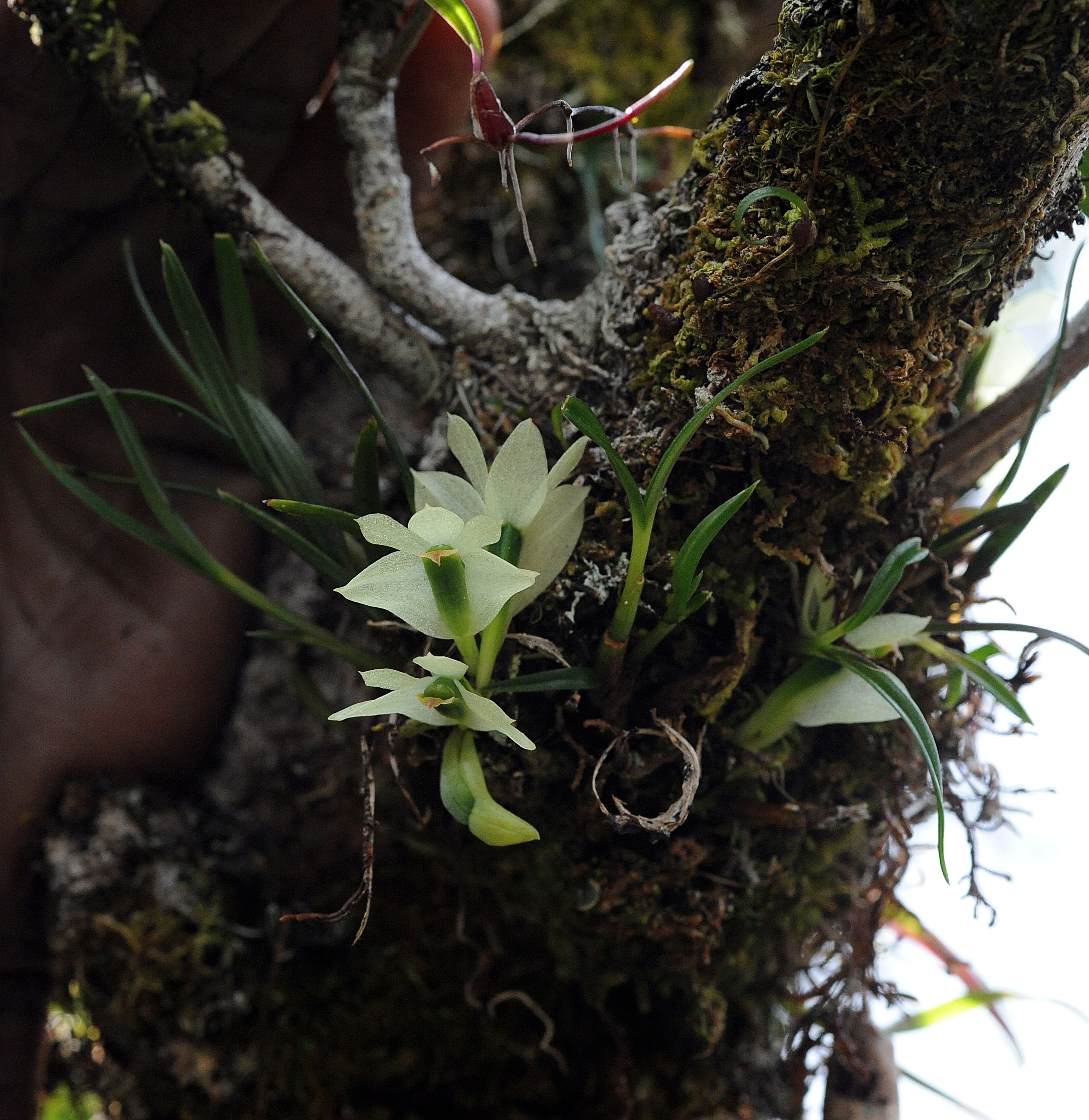 Found in New Guinea in mountain cloud forests on mossy tree trunks and twigs, at forest edges in subalpine grasslands and on trees in open grasslands at elevations of 1800 to 3600 meters as a mini-miniature to miniature sized, cool to cold growing epiphyte with ellipsoid or oval pseudobulbs carrying 1 to 8, distichous, arcuate, erect to suberect, soft, occasionally undualte margined, narrowly elliptic to oblanceolate to linear, obtuse to acute leaves that are deciduous with persistant leaf sheaths and blooms at any time of the year on a terminal, .7" [1.8 cm] long, simultaneously 1 to 2, rarely 3 or 4 flowered inflorescence arising on a leafy or leafless pseudobulb.