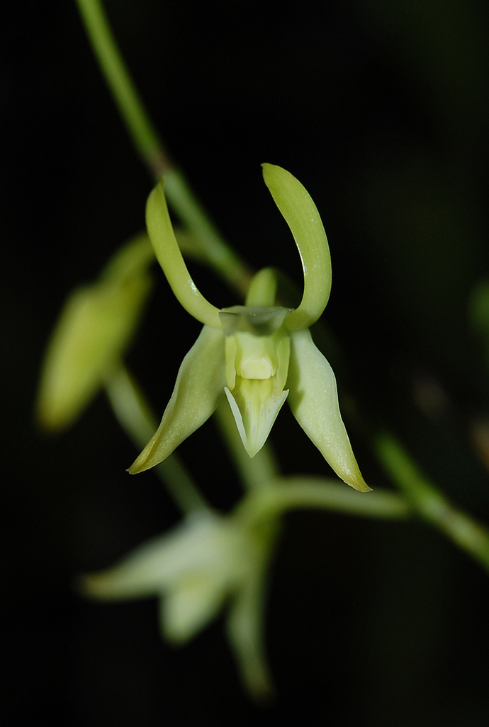 Similar to and occuring with D bicaudatum but it differs in it's larger flowers with a conical mentum and a colorful lip with a transversely oblong, apiculate mid-lobe