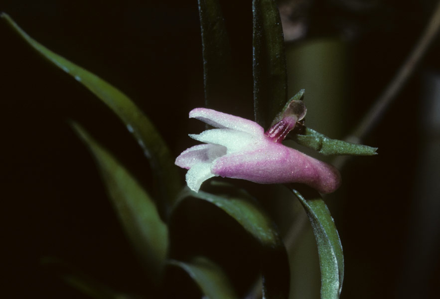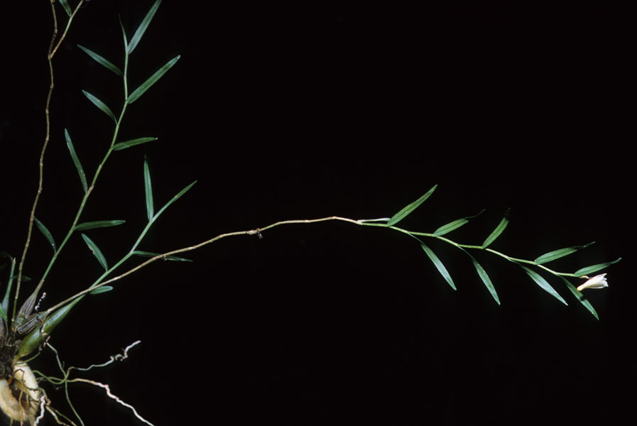 Found in Java and Sumatra in deep, moist shade at elevations around 500 to 1800 meters as a small to medium sized, warm to cool growing epiphyte with thick, ribbed, quadrangular pseudobulbs giving rise to an elongate, thin, wiry, occasionally branching stem carrying linear, minutely and unequally bilobed apically leaves that blooms in the summer on short, successively single flowered inflorescence arising from near the apex of leafy and leaflless stems.