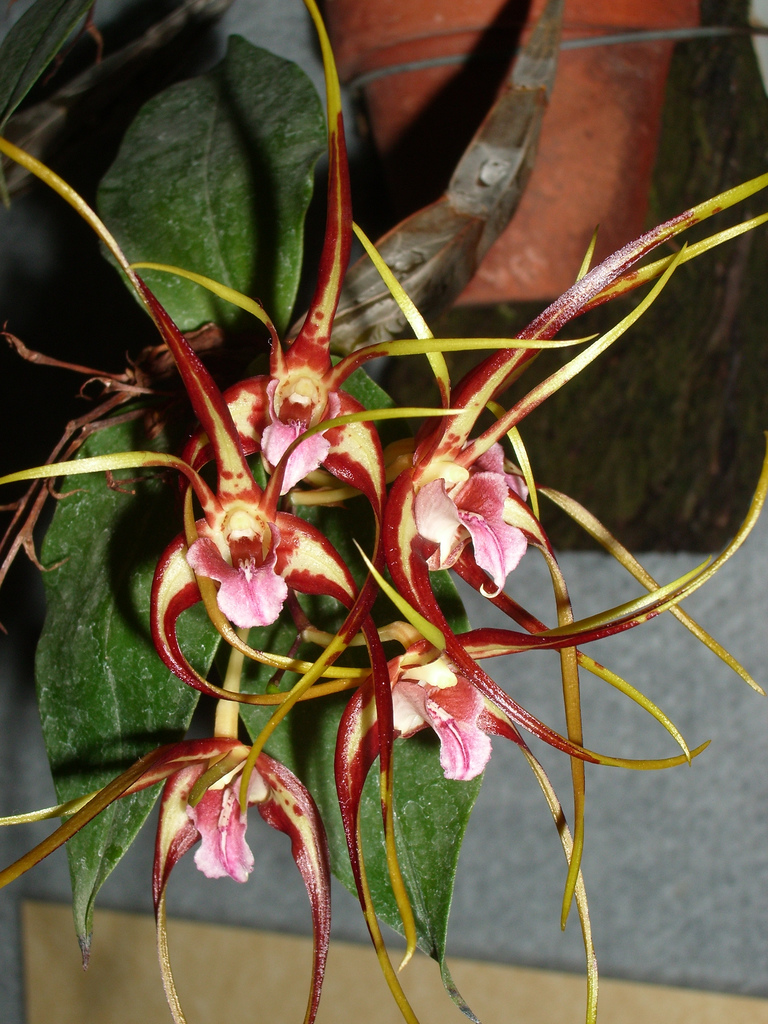 Found in New South Wales and northern Queensland Australia as a cool to warm growing, small to medium sized, epiphytic species from humid ravines or gullies at altitudes of 500 to 1200 meters, with semi-pendulous, clustered, 4 angled, widest at the middle, spindle shaped apically, from 7 to 10 noded stems carrying 2 to 3, ovate or oblong, acute, papery thin yet coriaceous, dark green leaves and blooms in fall till spring on a very short, raceme with minute floral bracts and 1 to 5, variable shaped, very fragrant flowers that arise from near the apex of the leafed cane. The inflorescence can rebloom over several flowering periods so do not remove any old inflorescence, also the nodes on the thickened area of the pseudobulb can generate inflorescence.