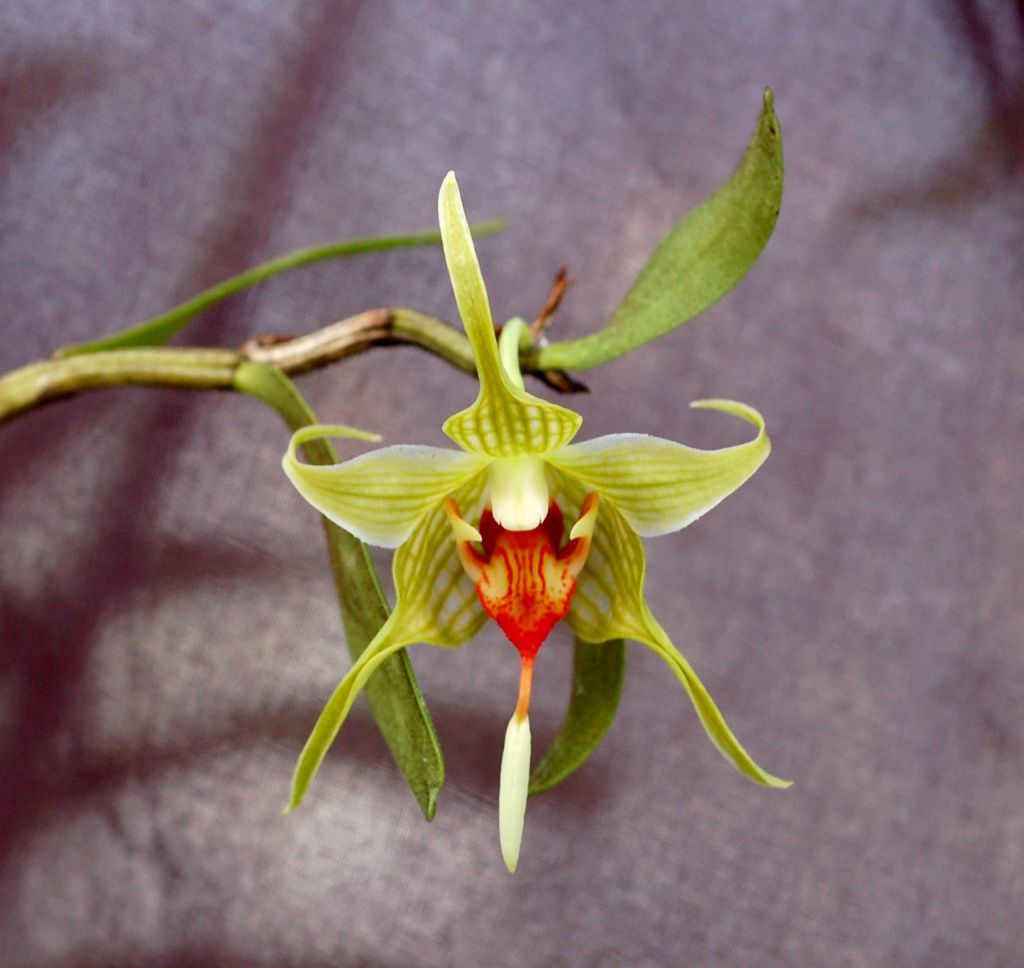 Found in Sumatra in pine and montane forests at elevations of 750 to 1500 meters as a small sized, warm to cool growing orchid with cylindrical stems carrying 8 to 9, oblong-ellptic, smooth on top, hairy beneath leaves that are apically bilobed and have leaf sheaths covered in black hairs, blooming on a very short, successively single, several flowered inflorescence that arises from the base of the leaf sheath opposite the leaf occuring in the fall.