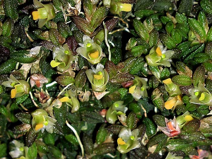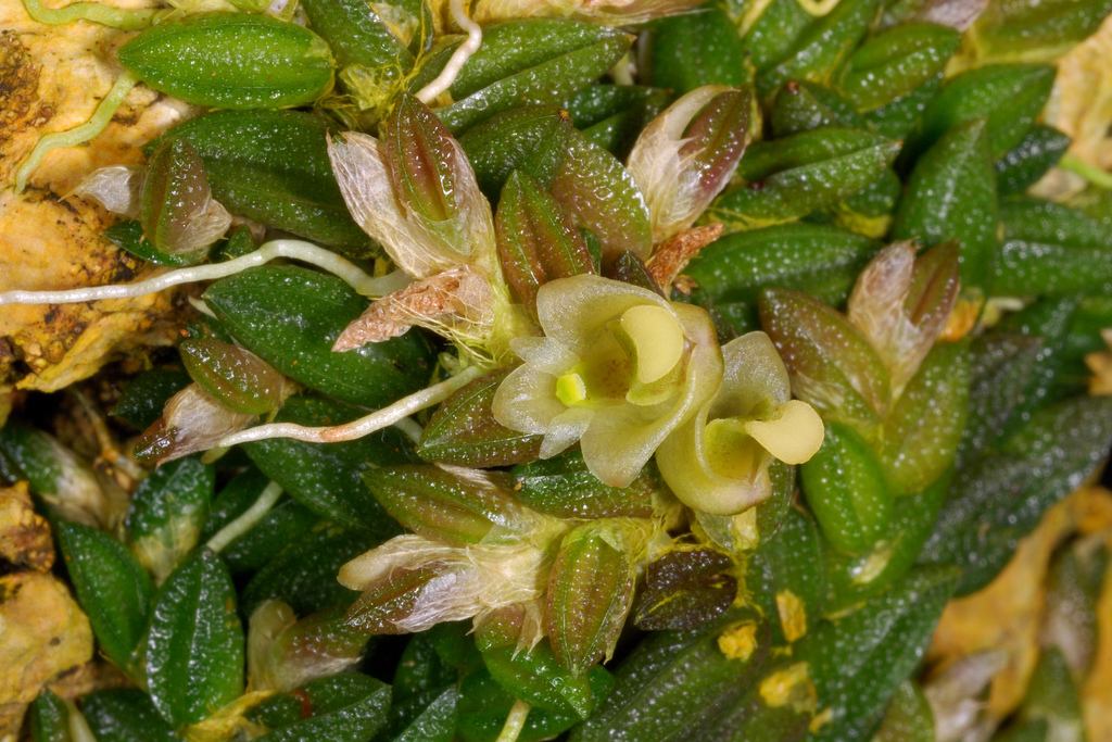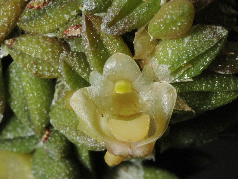 Found in northern Queensland Australia on trees and shady rocks as a miniature sized, hot to cool growing epiphyte or lithophyte at elevations of 50 to 1220 meters in exposed locations with a rhizome, with a small vestigal, basal pseudobulb, that produces leaves all along carrying many, alternate, channeled on top, rounded basally, sparkly leaves that blooms on a very short, single flowered inflorescence arising at the apex of the vestigal pseudobulb with longlasting flowers occurring in the spring.