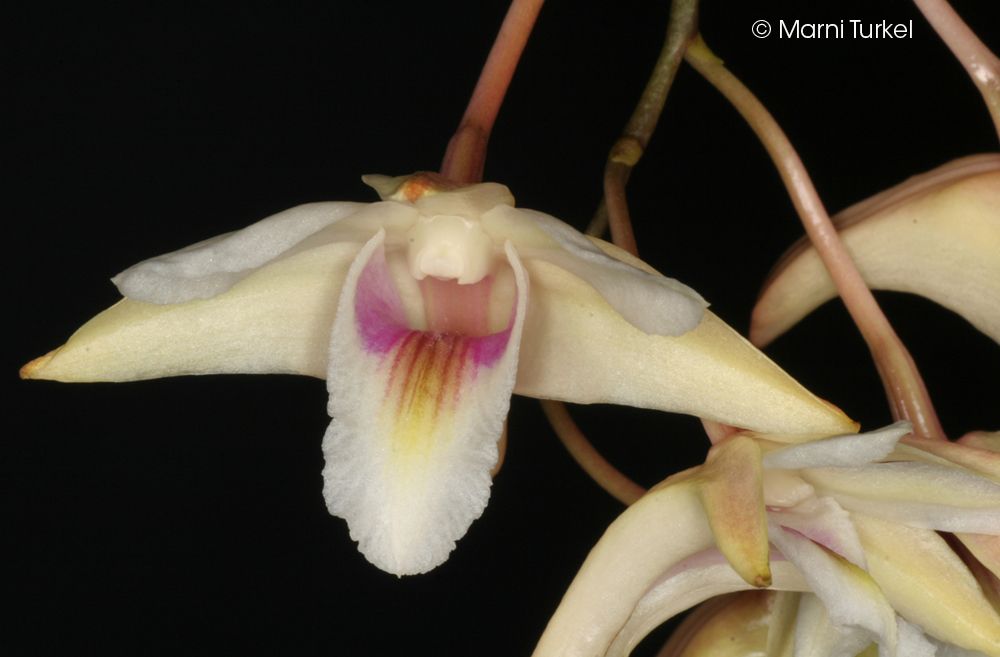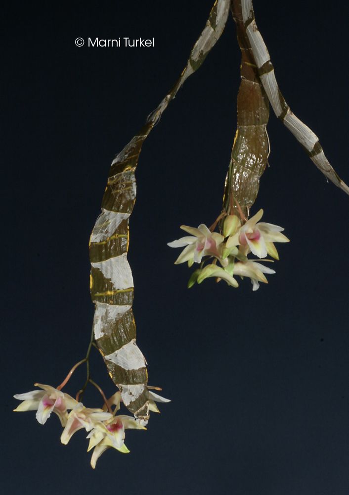 Found in the Moluccas on Ambon Island at lower elevations as a miniature sized, hot to warm growing epiphyte with flattened, slender stems carrying 10 to 12, oblong, deciduous, pale green, wavy margined, slightly basally twisted, 2 ranked leaves that blooms in the spring on a 2.4" [6 cm] long, pendulous, laxly 5 to 6 flowered inflorescence arising from the nodes towards the apex of the stem.