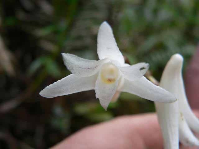 Found on Mt Kinabalu in northern Sabah Borneo in lower and upper montane forests at elevations of 1200 to 2300 meters as a medium sized, cool to cold growing epiphyte with many jointed, gently arching, yellow to greenish brown stems and carrying many, linear, thick, fleshy, rigid, sessile leaves with a sharp projection at the rounded apex that blooms in the summer and fall in situ on a short, successively single flowered inflorescence that arises from the fasciculate, scarious bracts on the upper nodes of the distal portion of leafless older stems.