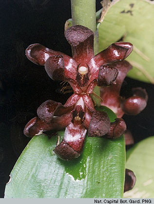 Found in New Guinea in lower montane forests at elevations around 900 meters as a giant sized, warm growing epiphyte with crowded, pendulous, terete, densely many leaved stems enveloped completely by leaf sheaths and carrying lanceolate-elliptic, subacute, sub patent leaves that blooms in the fall on a lateral from the stem, 2 flowered inflorescence arising through a laterally compressed, semiorbicular spathe.