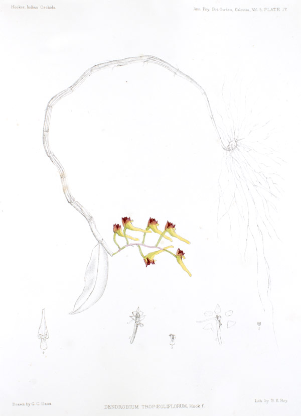 References W3 Tropicos, Kew Monocot list , IPNI ; *A Century of Indian Orchids J D Hooker 1895 drawing fide; Materials For a Flora of the Malayan Penninsula Part 1 Ridley 1907; Flora of Malaya Vol 1 Orchids Holttum 1953; Die Orchideen lieferung 11 Schlechter/Brieger 1981 as Pedilonum tropaeoliflorum; Flora of Malaya Vol 1 Holttum 1957; The Orchids of Penninsular Malaysia and Singapore Seidenfaden & Wood 1992 drawing fide; Orchid Species Culture Dendrobium Bakers 1996;