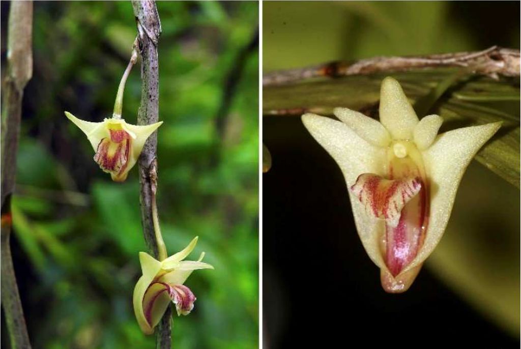 Found in southern Vietnam in primary and secondary evergreen broad-leaved montane forest on granite without elevational data as a medium to large sized, clustering branch epiphyte with a short rhizome with clustered, yellowish, erect and arching, slender, not swelling, laterally compressed, unbranched, manynodal, leafy in basal half, becoming leafless (or with rudimentary leaves) in upper part, internodes slightly widening toward apex stems carrying sessile, rigid, leathery, laterally compressed, distichous, ascending, slightly overlapping or alternate, oblique narrowly triangular, acute, base dilated into sheaths as long as the leaf and embracing stem leaves that blooms in the later summer on a lateral, arising from nodes on leafless, apical half of stem, ; peduncle (.6 to 1.2" [1.5 to 3 mm] long. single flowered inflorescence with papyraceous, triangular, shorter than the ovary floral bracts.