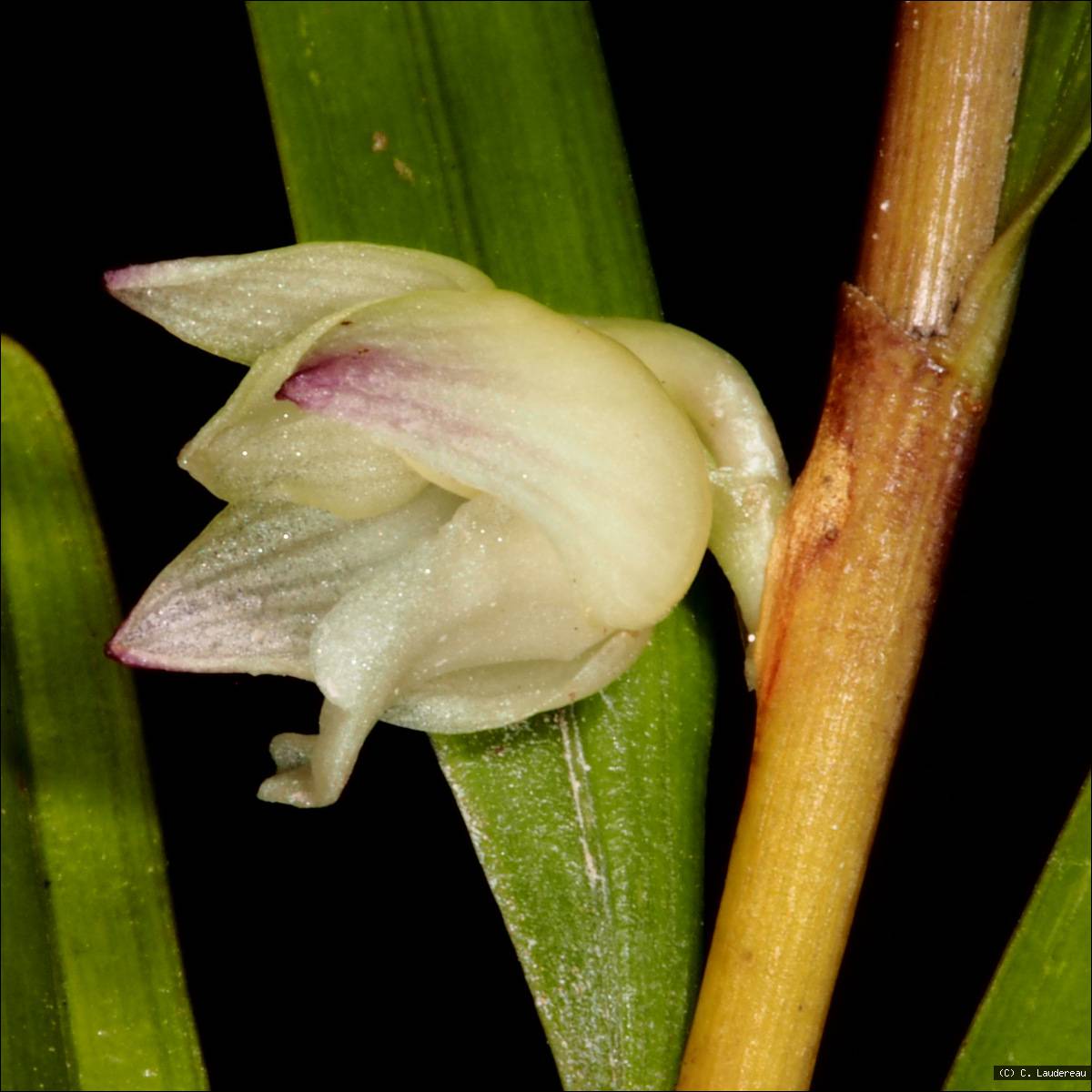Found in New Caledonia? and Fiji at elevations around 750 to 900 meters as a medium to just large sized, warm growing epiphyte with erect, reedlike, apically leafy stem carrying many, distichous, oblong-lanceolate, unequally bilobed apically leaves that blooms in the later spring on a very short, arising from along the stem, single flowered inflorescence carrying flowers that do not open well.