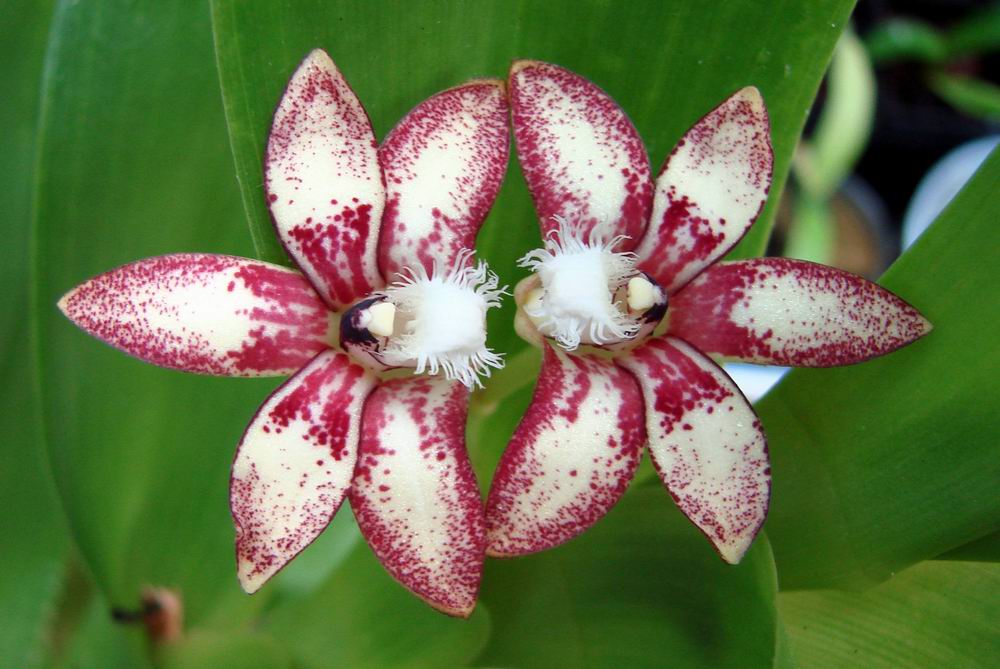 Found in northern Papua New Guinea and Bougainville at elevations of sea level to 400 meters as a medium to large sized, hot growing epiphyte on trees with a short, flattened stem carrying many curved, spreading leaves that blooms in the spring and summer on a very short to .8" [2 cm] long, 2 flowered inflorescence with short-lived flowers.