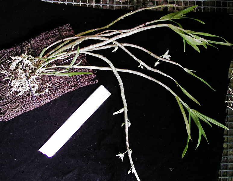Found in New Guinea in disturbed rainforests at elevations around 500 to 690 meters as a small to medium sized, warm growing epiphyte with stems carrying to 8, deciduous, leaves grouped in the apical 1/3 of the stem that blooms at most any time of the year on several, lateral, 1 to 3 flowered inflorescence arising on the leafless pseudobulbs and carrying flowers that last about 5 to 10 days.