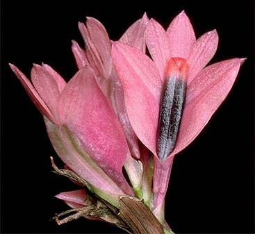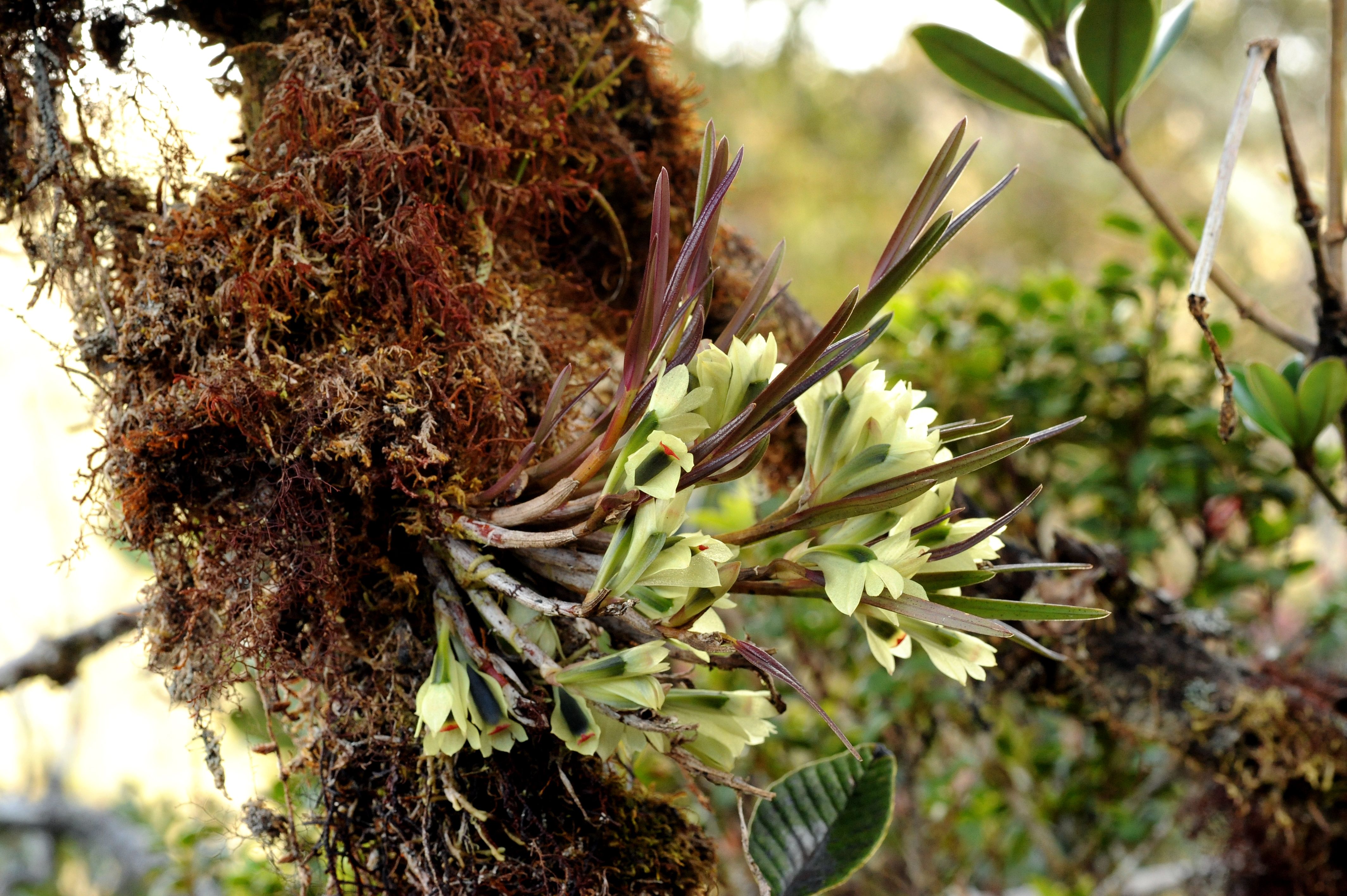 This epiphytic species is found in Papua and New Guinea at elevations up to 1200 meters in mountain cloud forests but can be found in the moss covered forest floor as well and blooms on an erect, few to several flowered raceme arising from within the top two leaves or near the apex of leafless canes with up to 5 flowers opening at the same time.