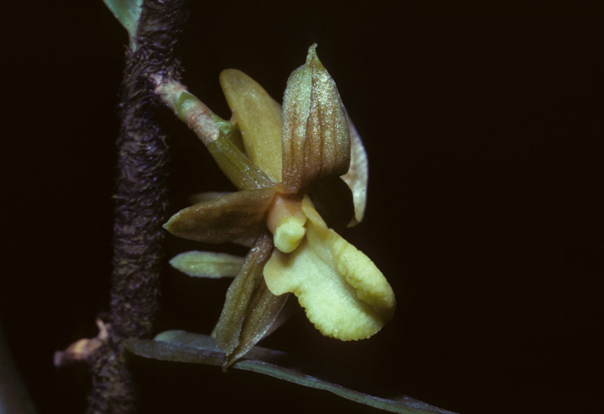 Found in Thailand, Malaysia and Borneo in decaying leaf litter of hill and lower montane forests at elevations of 500 to 1700 meters as a large sized, warm to cool growing terrestrial with an erect, sometimes branching, slender, wiry stem carrying many, linear-lanceolate, ridged, channeled, incurved along the margin, unequally bilobed apically, 2 ranked leaves with spotted and black hair covered leaf sheaths that bloom in the late winter on a short, single flowered inflorescence and carrying pendulous flowers