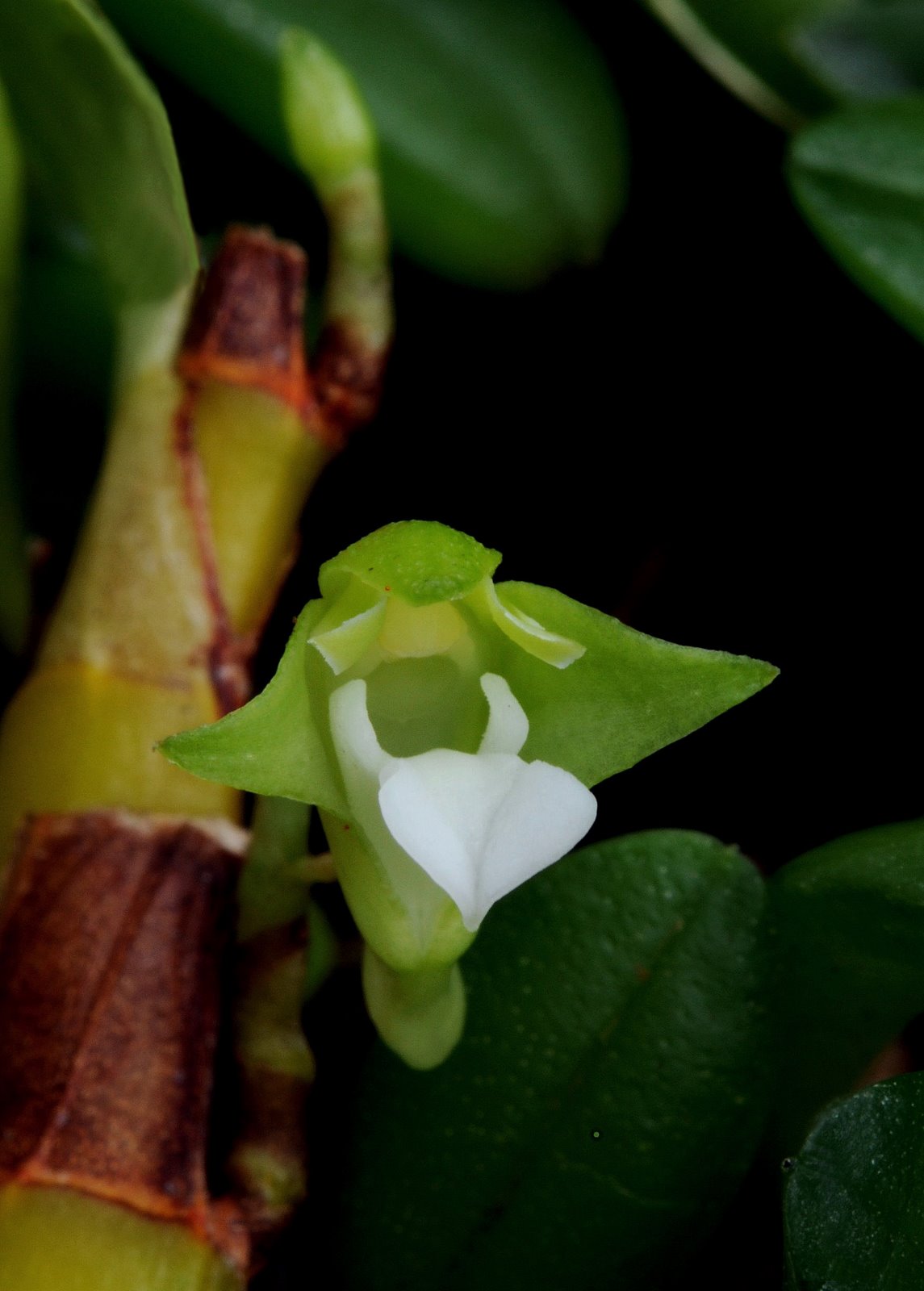 Found in the Moluccas, New Guinea and the Solomon Islands as a miniature sized epiphyte with yellow canes carrying many, linear leaves that blooms in the fall on very short, single flowered inflorescence arising all along the stem carrying successively opening flowers