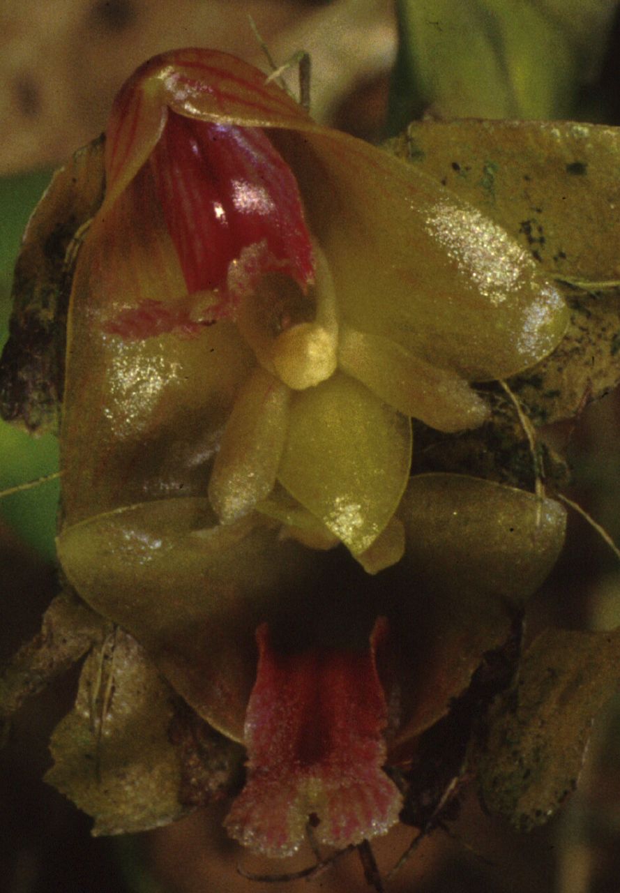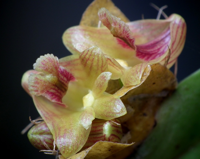 This orchid has a zigzag leaf pattern like Dichaea but the last 2 apical leaves always appear to be orange in color.
