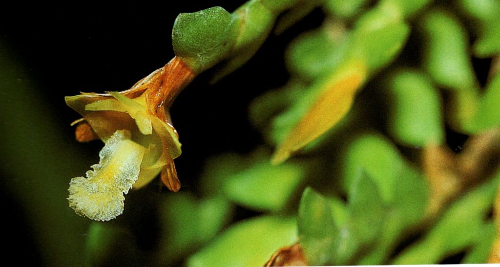Found in Borneo in lowland forest, stunted forest and upper montane mossy forests at elevations around 1700 meters as a miniature sized, cool growing epiphyte with clustered, semi-erect to spreading, sometimes pendent, simple, lowermost prtion leafless, leafy above stems caryring falcate-oblong, obtuse, succulent, rigid, coriaceous leaves that blooms on a subterminal, successively single, few flwoered inflorescence with obliquely ovate to oblong, obtuse to subacute, brownish green, dirty yellow to golden yellow florla bracts and carrying fragrant flowers with transluscent pale yellow tepals and a transluscent creamy white to pale yellow lip and dark yellow keels.