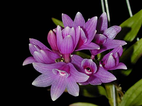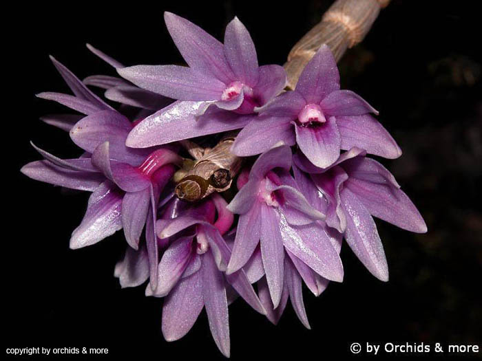 Found in the Philippines as a small to medium sized, warm growing epiphyte with slender, pendulous, clustered stems that rarely branch and carry many, lanceolate, pointed leaves and blooms on a short, 2 to 6 flowered inflorescence with showy flowers arising in the spring.