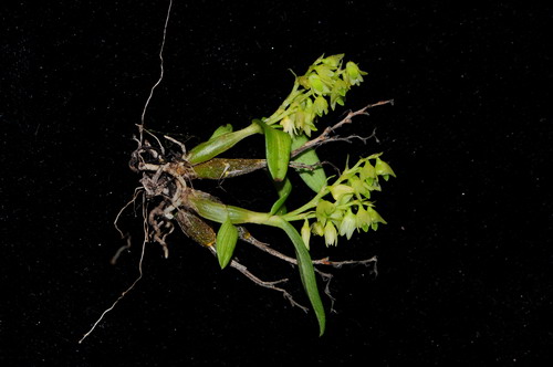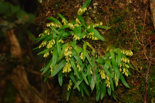 Found in Yunnan province of China ijn forests on trees at elevations around 1900 meters as a small sized, cool growing epiphyte with a spindle shaped stem with 2 to 3 nodes carrying 2 to 3, in 2 rows, slightly smaller at the base, and larger above, needle-shaped leaves that blooms in the late summer and earlier fall on 1 to 3, arising on the newest mature stem, .4 to .68" [1 to 1.7 cm] long, shorter than the leaf, several flowered inflorescence.