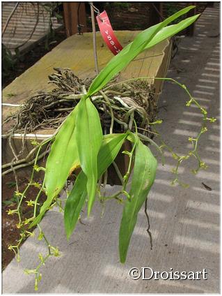 Found Ivory Coast, Liberia, Cameroon and Uganda in rainforests among lichens and mosses at elevations of 1000 to 1700 meters as a small sized, warm to cool growing epiphyte with a short stem carrying 2 ranked, clustered towards the apex, lanceolate-ligulate, unequally and shortly bilobed apically, basally clasping leaves that blooms in the summer everywhere except in winter in Uganda on axillary or below the leaves, 2 to 3" [5 to 7.5 cm] long, laxly many flowered inflorescence with amplexicaule bracts.