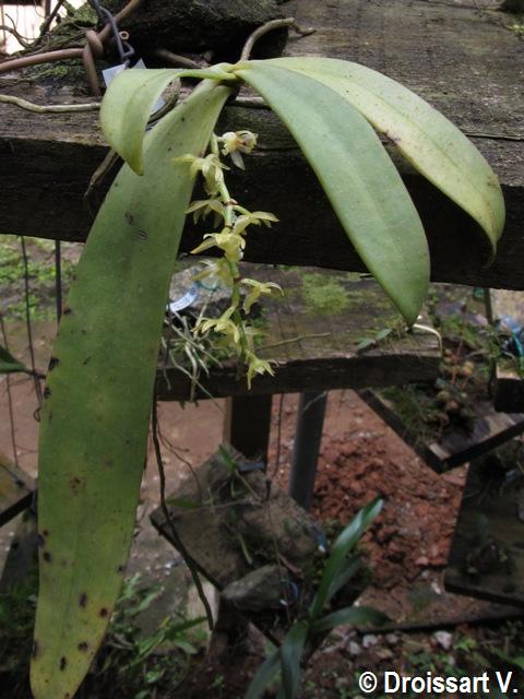 Found in Ivory Coast, Nigeria, Cameroon and Gabon in shady rainforests at low elevations as a small sized, hot to warm growing epiphyte with a horizontal, short stem carrying 3 to 5, large, in 2 rows, basally twisted to all be in one plane, fan-like, pendendt, oblanceolate, unequally bilobed apically, leaves that blooms in the later spring on a pendent, to 5.2" [13 cm] long, 13 to 16 flowered inflorescence
