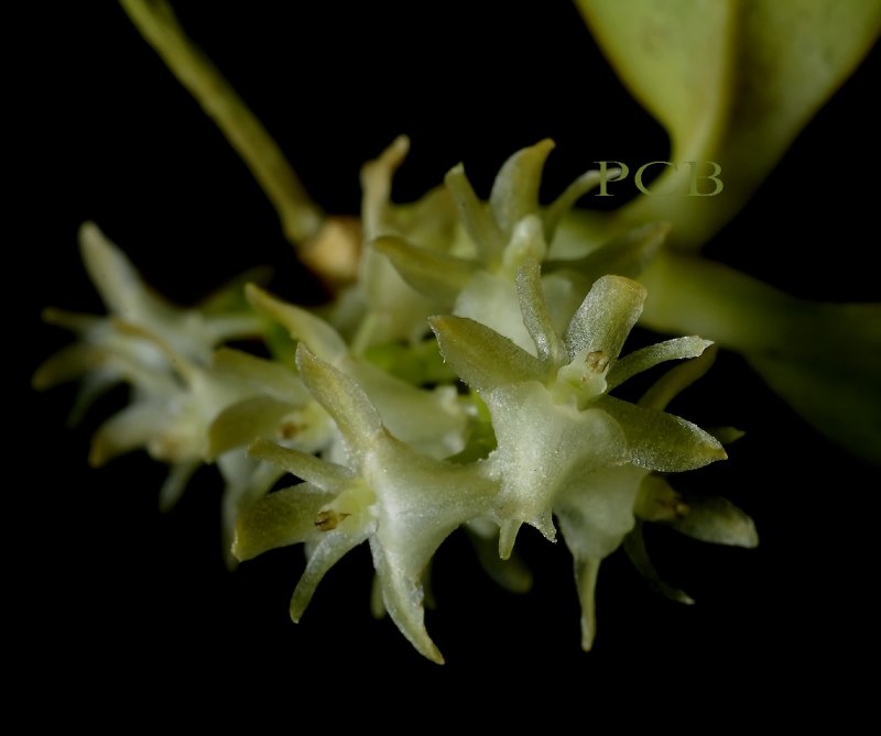 Found in Ivory Coast, Ghana and Gabon in lowland shady wet forests and bush as a large to giant sized, hot growing epiphyte with elongate, pendant stems carrying many, 2 ranked, elliptic, basally twisted to all face in one planr, bilobed apically, round lobed leaves that blooms in the later spring on a pendant, arising from the base of the leaf bearing sheath, 3.2 to 5" [8 to 12.5 cm] long, 8 to 14 flowered inflorescence.