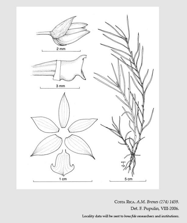 Found in Costa Rica at elevations around 1000 to 1150 meters as a miniature to small sized, cool growing epiphyte with a caespitose to basally branching, slender, erect to arcuate stem enveloped almost completely by imbricating leaf sheath bases carrying articulate, distichous, many, erect-spreading, commonly conduplicate below the middle, narrowly linear, shortly acuminate to apiculate leaves that blooms in the fall on many, axillary, short to .4 to .48" [1 to 1.2 cm] long, single flowered inflorescence with 2 basal, imbricating, cylindrical, scarious sheaths and terminating in a scarious, shallowly infundibuliform, acute bracts which encloses the linear bracteole and carrying small, submembraneous flowers with smooth ovary and capsules.