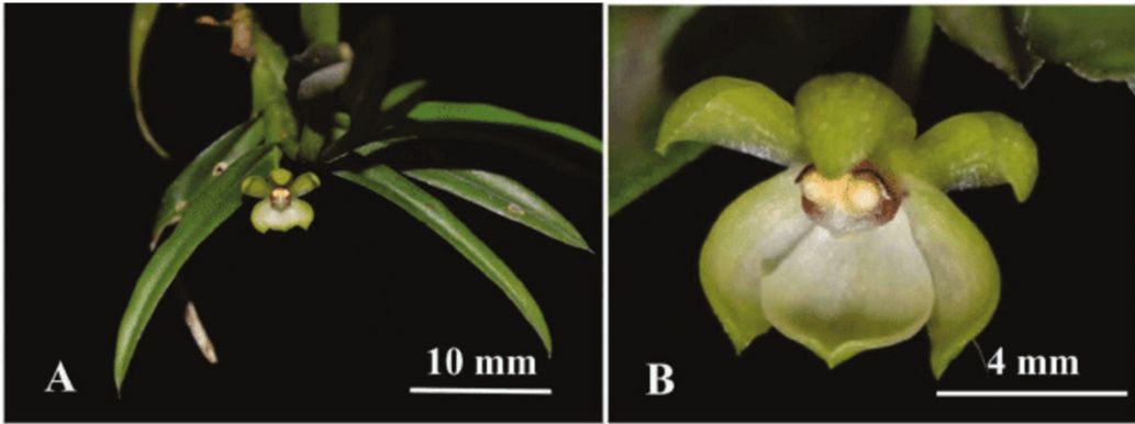 Found in Amazonas State of Brazil in dense ombrophilous forest, at elevations of 90 to 100 meters as a miniature to small sized, hot growing epiphyte with a terete, suberect stem enveloped by leaf sheathing bases carrying distant,elliptic, acute, deep green, glabrous, deciduous, articulate with the leaf sheath below leaves that blooms in the late spring on an axillary, to .72" [1.8 cm] long, single flowered inflorescence with acute glabrous, cream to whitish bracts and similar floral bracts, a glabrous ovary and carrying campanulate flowers.