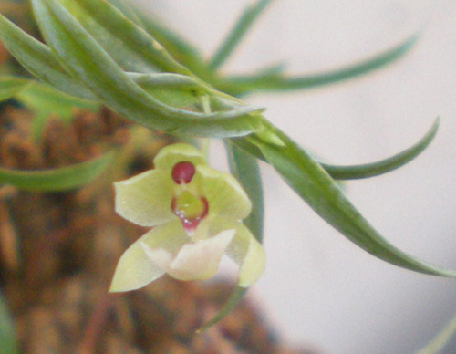 Found in Morona-Santiago Ecuador at elevations around 1000 meters as a small sized, warm to cool growing epiphyte with pendulous, simple to branched towarrds the base stems enveloped by imbricating leaf sheath bases carrying distichous, dense, horizontally spreading, articulate to the sheath, green, linear-elliptic, apiculate leaves that blooms in the summer on an axillary, .4" [1 cm] long, much shorter than the leaves, filiform, single flowered inflorescence with a muricate ovary and capsule