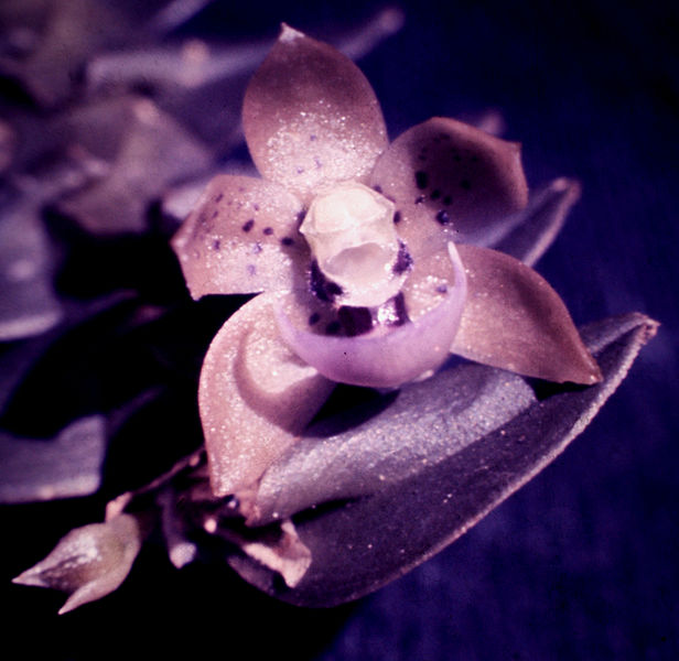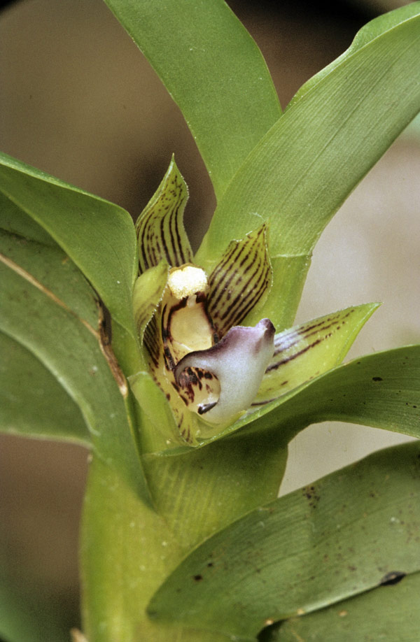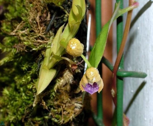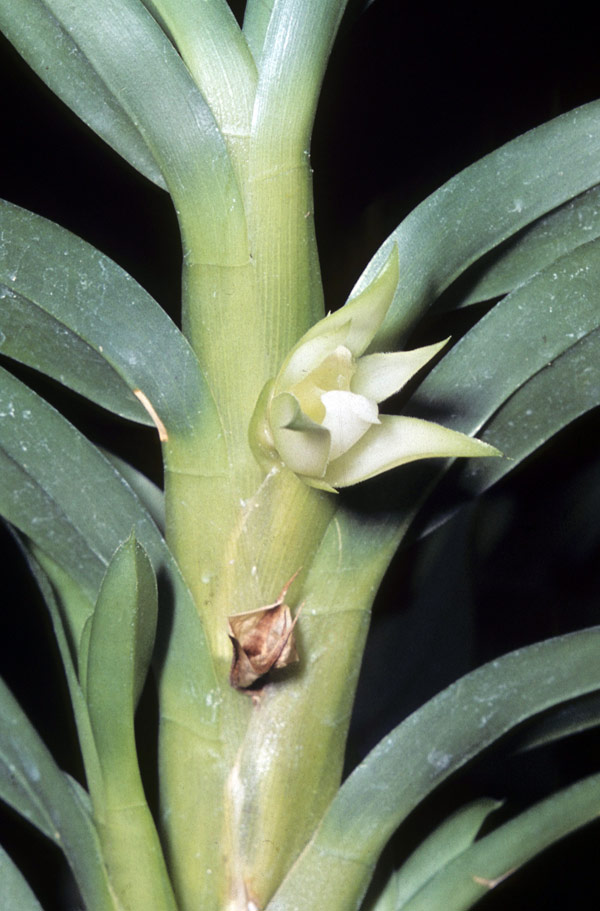 Found in Haiti, Jamaica, Trinidad & Tobago, El Salvador, Nicaragua, Panama, Costa Rica, Venezuela, Colombia, Ecuador, Peru, Bolivia, and Brazil in wet montane forests at elevations around 600 to 2500 meters as a miniature to medium sized, warm to cool growing epiphyte with erect to pendant, simple to rarely branched, stiff to flexuous stems completely enveloped by imbricate, leaf bearing sheaths and carrying many, membraneous to subcoriaceous, disitchous, oblong to elliptic-oblong to elliptic, oblique, rounded, subacute to mucronate leaves that blooms in the spring through fall on an axillary, .25 to .4" [8 to 1 cm] long, single flowered inflorescence carrying large for the genus, fleshy flowers.