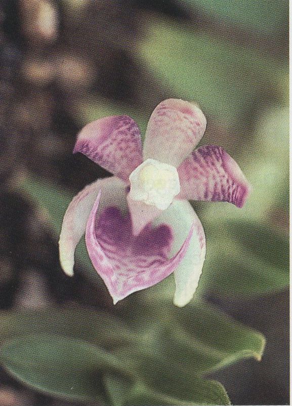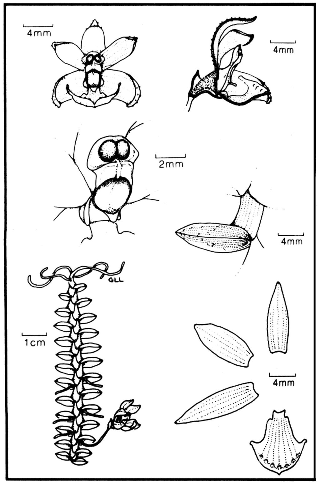 Found in Panama, Colombia and Ecuador at elevatiosn of 260 to 1100 meters as a miniature to small sized, hot to cool growing epiphyte with a pendant, simple to basally branched stem enveloped by imbricating sheathing leaf bases carrying distichous, dense, horizontally spreading, not articulated, dark green, elliptic-oblong, obtuse, apiculate, cross veins in between the principal parelell veins leaves that blooms in the fall on an axillary, suberect, longer than the leaves, filiform, to .8" [2 cm] long, single flowered inflorescence with densely muricate ovary and capsule ad carrying pale pink flowers with the tepals heavilly flecked with blue, the white lip also blue spotted and the column and anther are white.