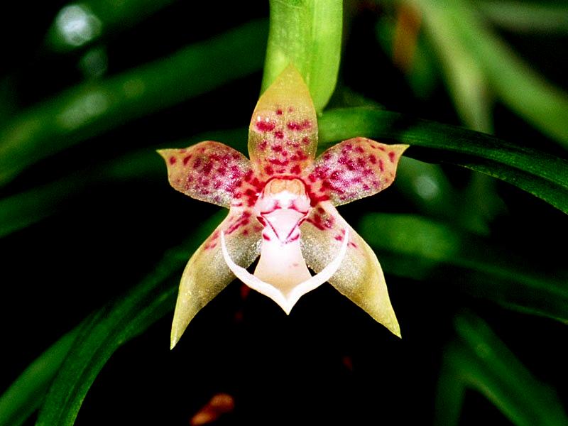 Found From Mexico, Guatamala, Belize, Honduras, Nicaragua, Costa Rica, Panama, Colombia, Venezuela, Ecuador, Peru and Brazil in tropical moist and wet rain forests as a small sized, hot to cool growing epiphyte at elevations of 10 to 1200 meters with erect to arched, cane-like stems carrying, distichous, deciduous, lanceolate, grey-green leaves that blooms in the spring on an axillary, towards the apex, short, .4 to .64" [1 to 1.6 cm] long, single flowered inflorescence with a smooth ovary and capsules.