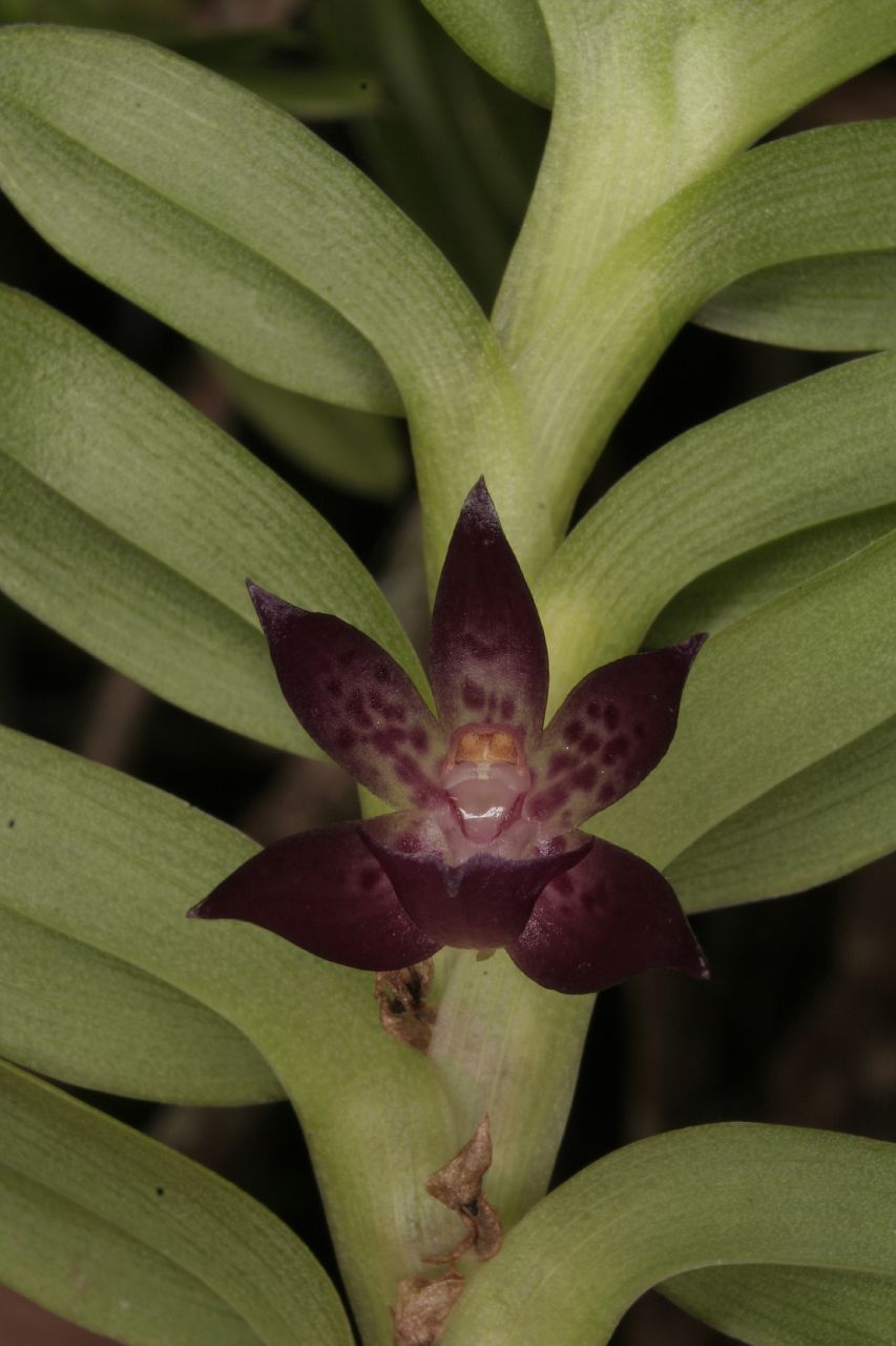 Found in Colombia and Ecuador in pluvial forests at elevations of 850 to 1250 meters as a small sized, warm to cool growing epiphyte with a cane-like, short stem enveloped completely by imbricate leaf bearing sheaths carrying oblong-ovate, stiffly distichous, apiculate, pale yellow green, keeled leaves that blooms at most any time of the year on an axillary, .4" [1 cm] long, single flowered inflorescence with broadly ovate floral bracts